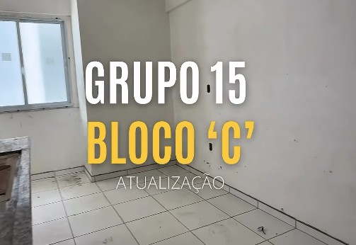 Grupo 15 Bloco “C”, o revestimento de gesso nas unidades já teve início, alcançando o 2º pavimento.